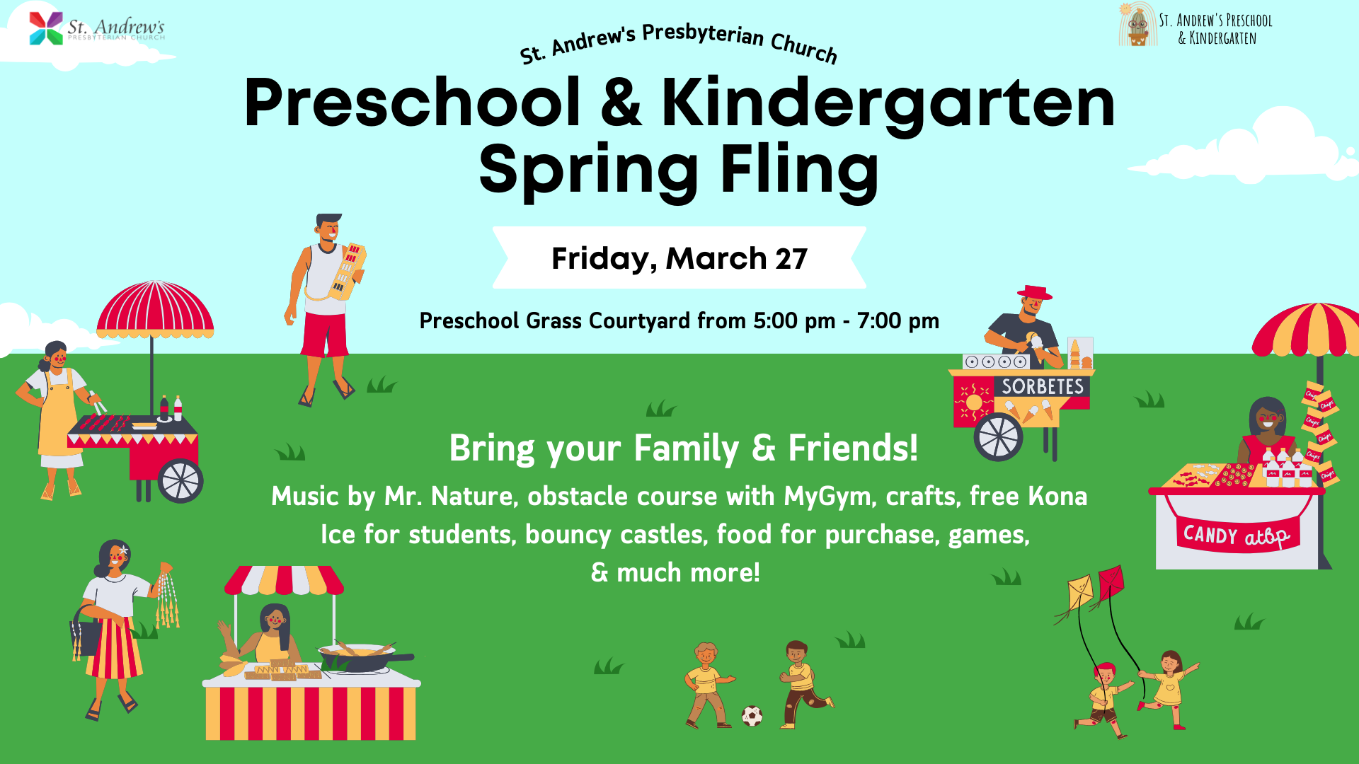 Please save the date for our Preschool and Kindergarten Spring Fling on March 27 from 5pm-7pm in the Preschool Grassy Courtyard! There will be music by Mr. Nature, an obstacle course with MyGym, crafts, free Kona ice for students, bouncy castles, food for purchase, games, & much more! This event is open to our school community and the public!